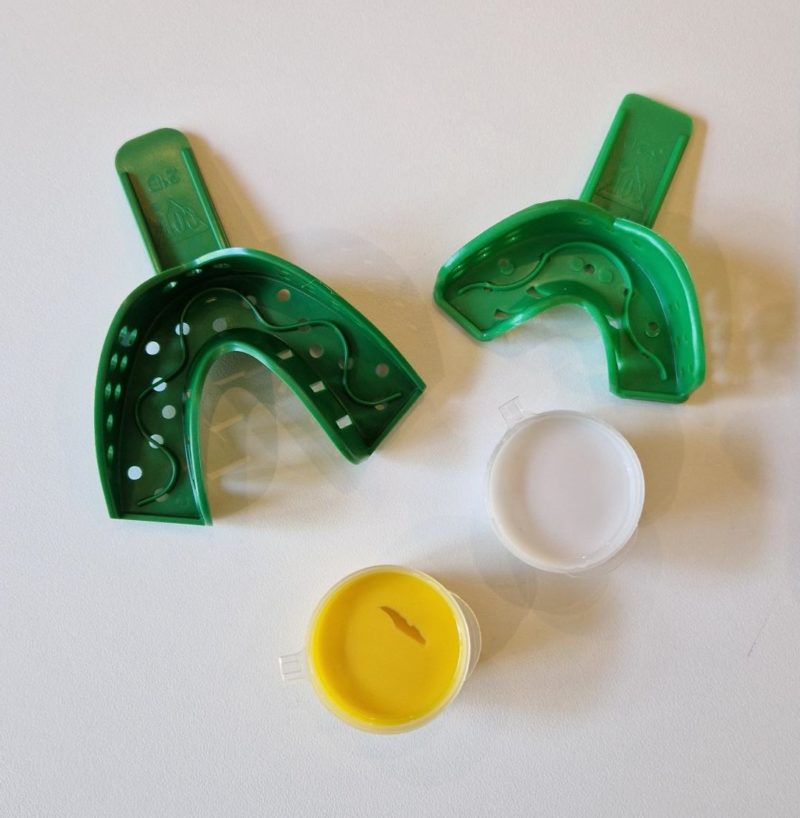 Deze afdrukset bestaat uit: 2 afdruklepels, afdrukmateriaal (twee kleuren kneed pasta’s), gebruiksaanwijzing, bestelformulier en een retourenvelop.